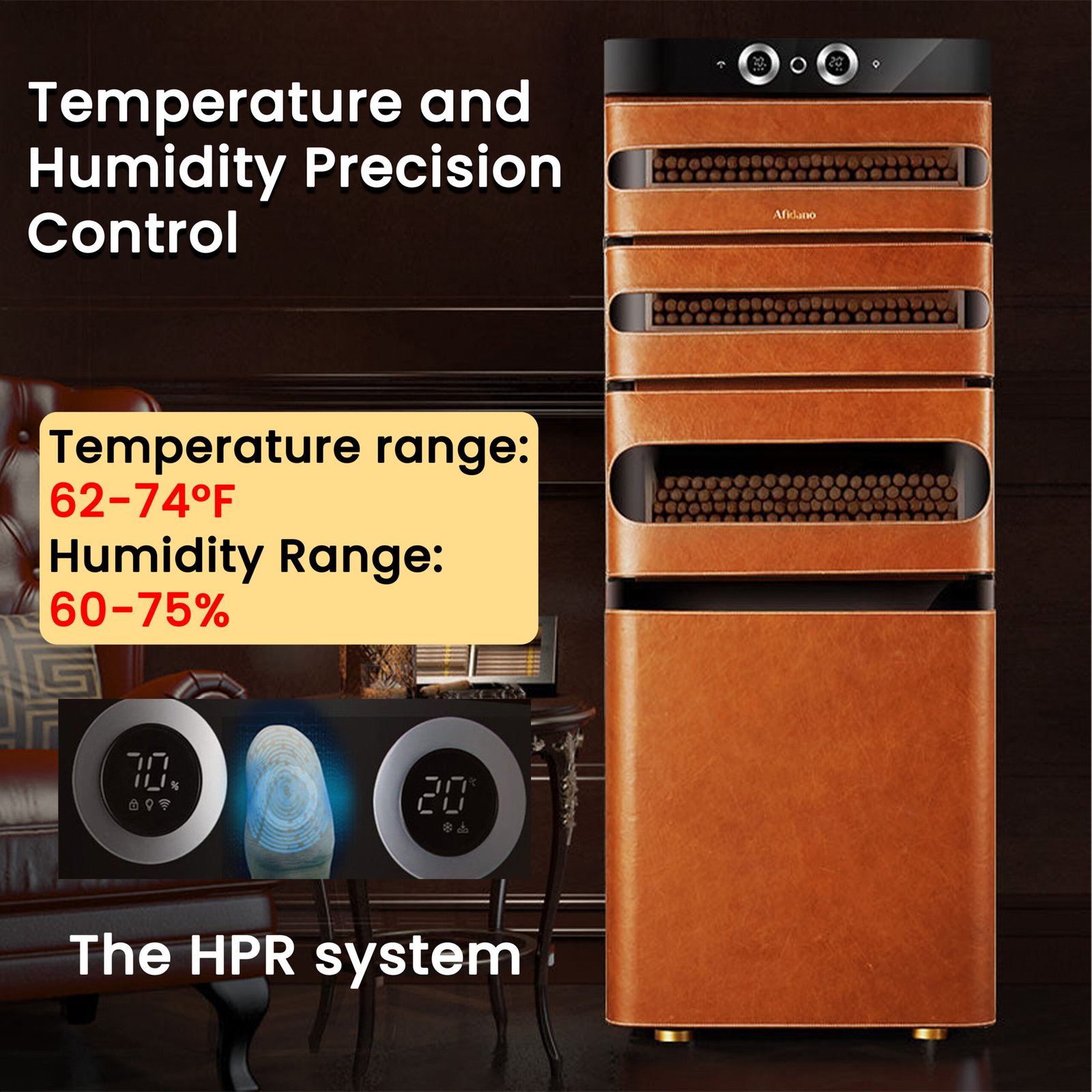 The HPR system has 6 components that ensure the accuracy and reliability of temperature and humidity, maintaining the perfect climate for your cigars. Temperature range: 62-74°F; Humidity Range: 60-75%. You can have peace of mind knowing your cigars are being kept in optimal conditions.