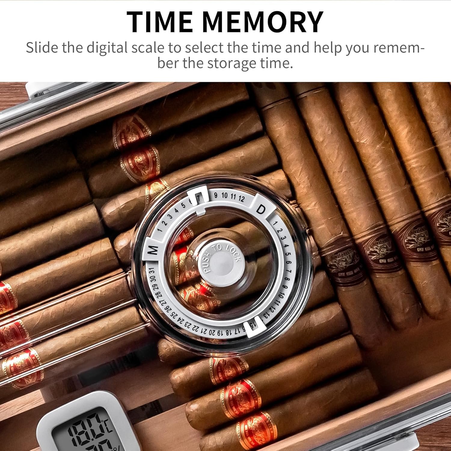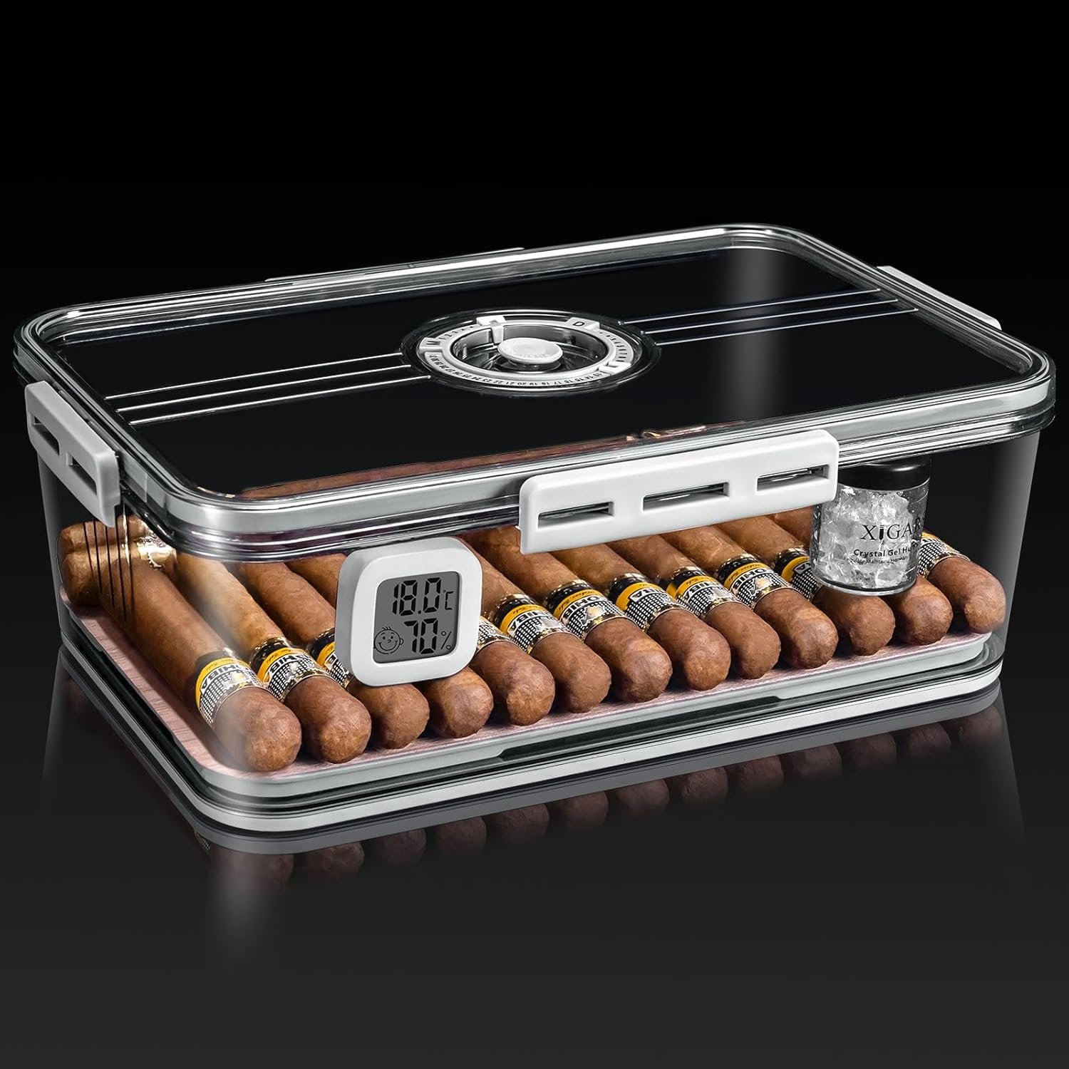 • Transparent & Functional: The clear design allows you to view your collection easily, while the built-in hygrometer helps you monitor humidity levels.