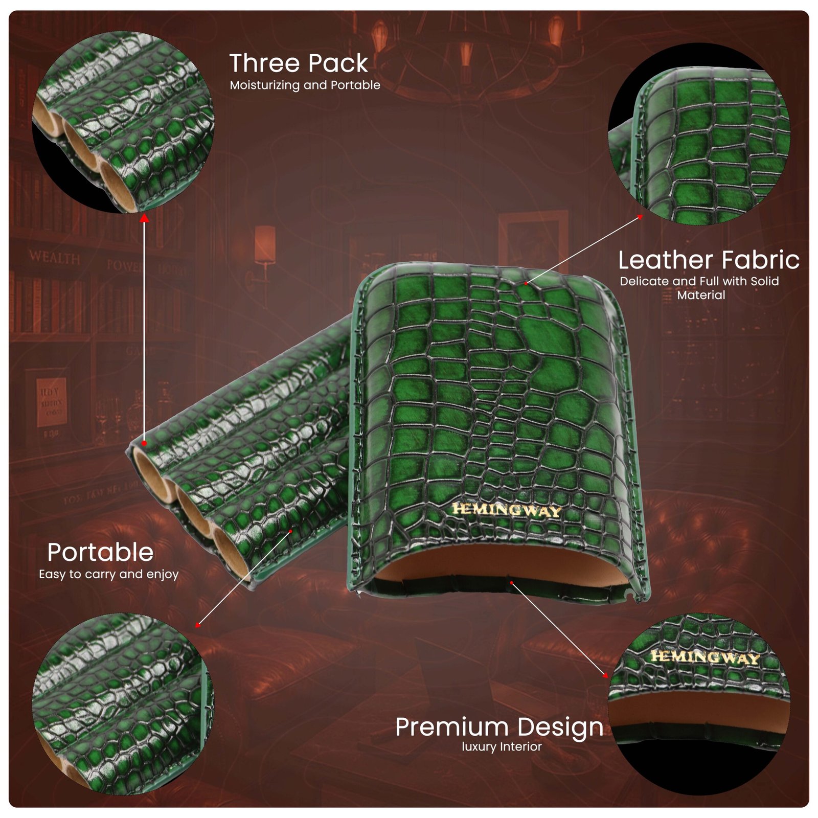 Hemingway Portable Cigar Case 3 Cigars Holder Premium leather Cigar Case – GREEN