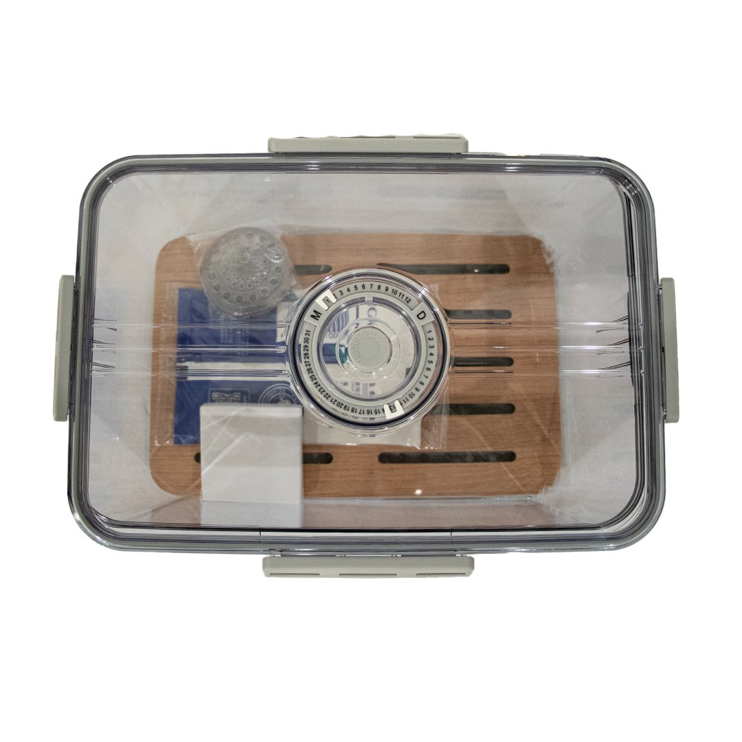 Keep your cigars in perfect condition with this modern, transparent humidor. Its airtight acrylic design and a secure-latch lid protect your collection from dryness, making it ideal for both home storage and travel. Inside, a removable cedar wood tray naturally enhances flavor, while the built-in hygrometer lets you monitor humidity with a quick glance. This clear humidor offers the perfect blend of visibility, portability, and superior cigar preservation.